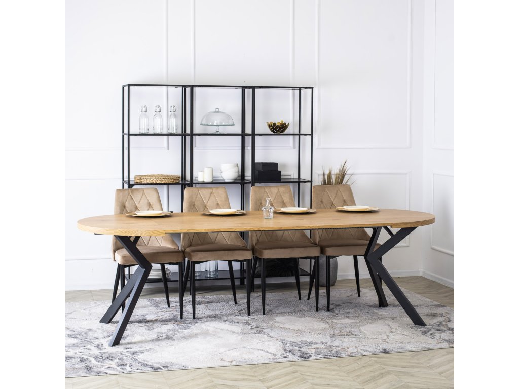Ploča stola je debljine 3,6 cm i proizvedena je od lamelirane MDF ploče u boji zlatnega hrasta . Otporna je na ogrebotine i udarce. Stol se može rasklapati. Zahvaljujući prisutnosti 3 umetka, stol možete produljiti s osnovnih 100 cm na maksimalno 250 cm (svaki umetak je dugačak 50 cm). U ovom modelu umetci nisu skriveni ispod ploče, već ih treba pohraniti na zasebno mjesto.