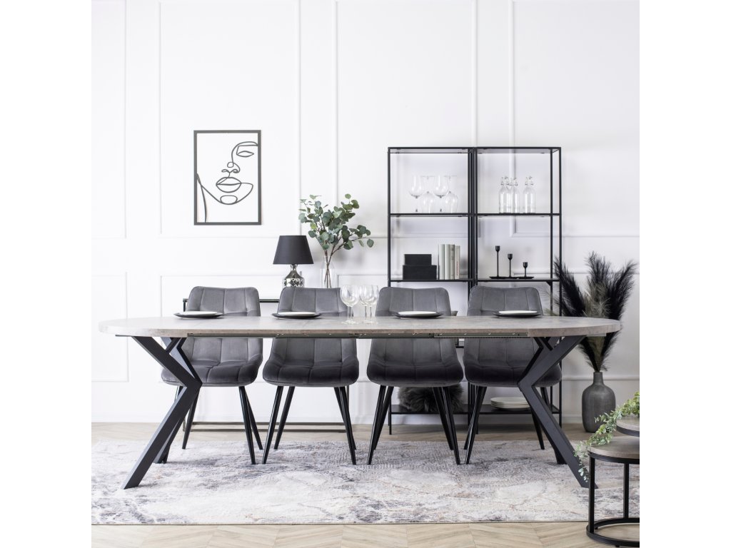 Ploča stola je debljine 3,6 cm i izrađena je od lamelirane MDF ploče s uzorkom betona. Otporna je na ogrebotine i udarce. Stol se može rasklapati. Zahvaljujući prisutnosti 3 umetka, stol možete produljiti s osnovnih 100 cm na maksimalno 250 cm (svaki umetak je dugačak 50 cm). U ovom modelu umetci nisu skriveni ispod ploče, već ih treba pohraniti na zasebno mjesto.