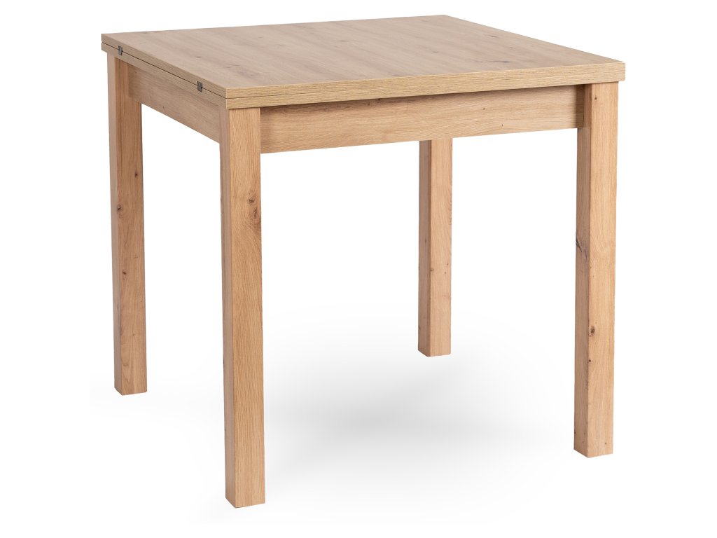 Ploča stola debljine 3,6 cm izrađena je od laminirane MDF ploče u boji hrasta artisan. Otporna je na ogrebotine i udarce. Stol ima rasklopivu funkciju, koja funkcionira poput otvaranja knjige – dovoljno je pomaknuti gornji dio u stranu i otvoriti ploču.